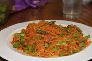 As you do that, add oil to a large pan over medium heat and add the onion, garlic, carrot, salt, and pepper. Cook until tender. About 8 minutes. Add the tomato paste to the carrots et al. and 1/2 a cup of the hot water. Stir to melt the tomato paste and creat a sauce. Meanwhile, add the asparagus to the hot water to cook quickly. As the asparagus cooks stir the oregano, thyme and parsley into the sauce pan. It only takes a moment to cook the asparagus to a beautiful bright green. When you see that, reserve a cup of the asparagus water and drain the asparagus. Add the asparagus to the sauce. If it needs more liquid add the water you reserved. Mix the sauce with the spaghetti squash to fully incorporate the ingredients. Serve immediately with parmesan on the table for anyone interested in adding cheese.